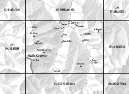 Productomschrijving: Kaart 1345 - Aanpalend aan de grens van het drie landen punt, maakt dit gebied deel uit van het Mont blanc massief.
