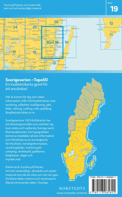 Elke kaart heeft een schaal van 1:50.000, wat zorgt voor optimale balans tussen detail en overzicht – ideaal voor wandelen, fietsen en andere buitensporten. De kaarten zijn gebaseerd op actuele gegevens van Lantmäteriet, het Zweedse nationale landmeetkundig instituut. Hierdoor bevatten ze betrouwbare en actuele informatie over wandelpaden, hoogtelijnen, meren, rivieren, bosgebieden, moerassen, wegen, sporen en bebouwing.