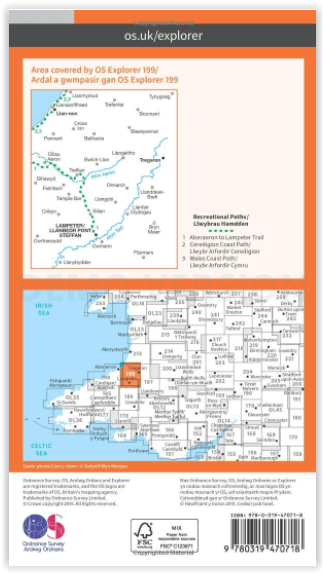 Productdiscription: Map sheet number 199 covers Lampeter and Tregaron. Highlights include Ceredigion Coast Path, Afon Teifi and Afon Aeron. Also includes Llan-non, Bronnant, Bryn Mawr, Cwmann and Cribyn. The OS Explorer map for Lampeter is available in both the standard paper version and weatherproof 'Active' version.