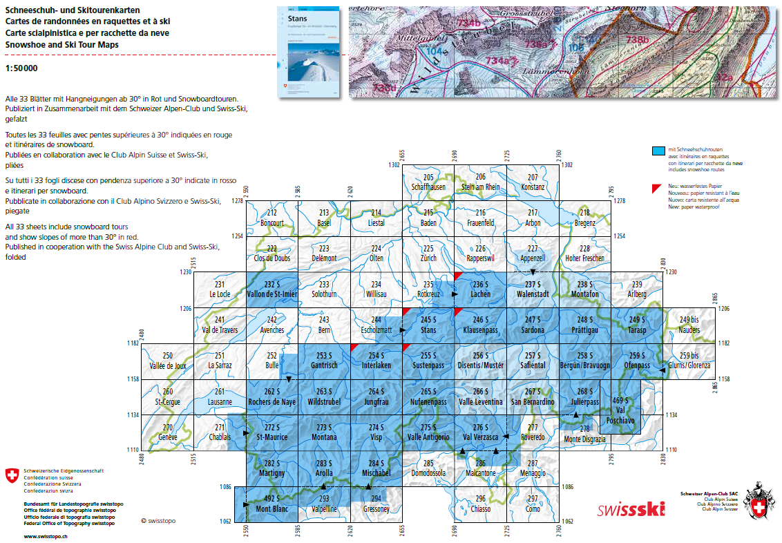 Detail: Zeer gedetailleerde topografische wandelkaarten van een klein stuke Zwitserland met schaal 1:50.000. De topografische details van deze kaarten zijn onmetelijk goed; de werkelijkheid is perfect op weergegeven, en is van uitzonderlijk hoge Kwaliteit. Ze zijn geschikt voor alle soorten gebruik: voor eenvoudige wandeltochten in simpel terrein tot zware bergtochten en beklimmingen. Als kaart zijn het de meest gedetailleerde die er te vinden zijn. De kaarten worden gemiddeld om de 3 tot 4 jaar vernieuwd.
