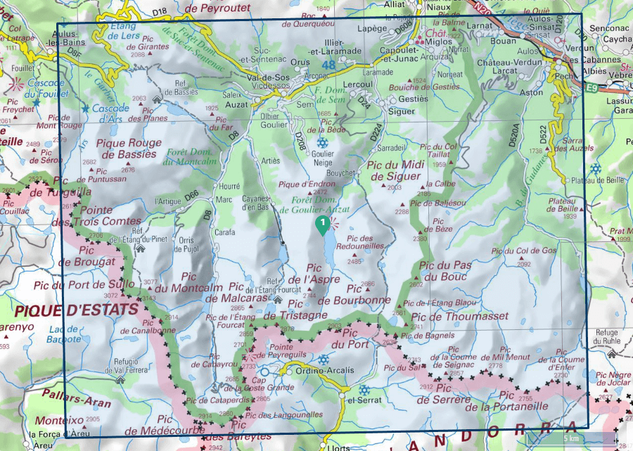 Te ontdekken: Parc naturel régional Pyrénées ariégeoises,Forêt Domaniale de Goulier-Auzat, Forêt Domaniale du Montcalm, Forêt Domaniale de Sem, Bois de Gudanes, Forêt Domaniale de Suc-et-Sentenac,Pic du Port de Sullo, Pic des Bareytes, Pic de Cabayrou, Pointe de Peyreguils, Pic du Far, Pic des Planes, Pique Rouge de Bassiès, Pic de Cataperdis, Pic de Mil Menut, Pic de Bourbonne, le Quiè, Pic de Puntussan, Pic de Bagnels, Pic de Tristagne, Pic d,Cascade d'Ars, Refuge des Étangs de Bassiès, Refugio de Val Ferrera, Refuge de l'Étang du Pinet.