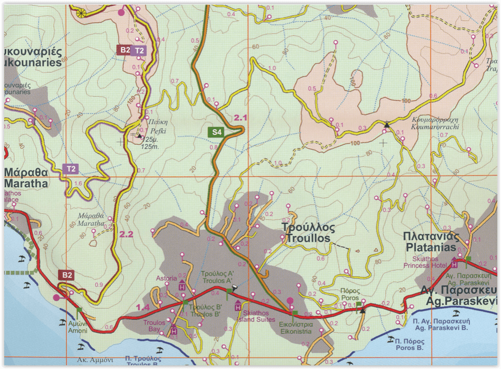 Productomschrijving: Een algemene, gedetailleerde wandelkaart van het eiland Skyathos gelegen in de Noordelijk Sporaden in de Griekse eilanden. De kaart omvat alle nodige toeristische informatie zoa shotels e.a. verblijfplaatsen.