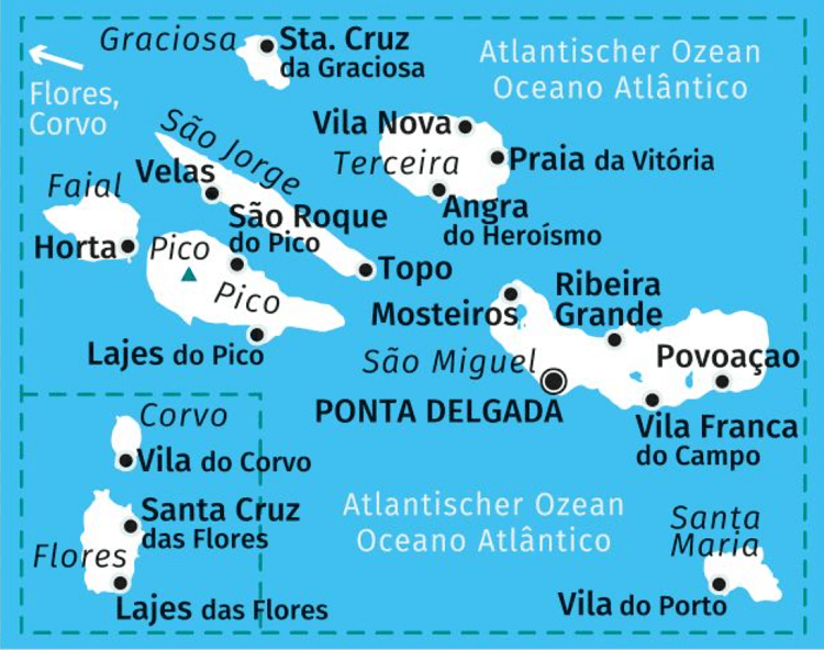 Duitse omschrijving: Die neun Azoren-Inseln gehören zu Portugal und liegen mitten im Atlantik – 1500 km von der Küste Portugals und 3500 km von Amerika entfernt; sie sind vulkanischen Ursprungs, wetterbedingt sehr grün und bieten ein gut markiertes Wandernetz. - Der Archipel besteht aus drei Inselgruppen – die östliche Gruppe mit Sao Miguel und Santa Maria, die zentrale Gruppe mit Terceira, Sao Jorge, Graciosa, Pico und Faial. Die Westgruppe mit den Inseln Flores und Corvo, Hauptstadt der Azoren ist Ponta Delgada auf Sao Miguel.
