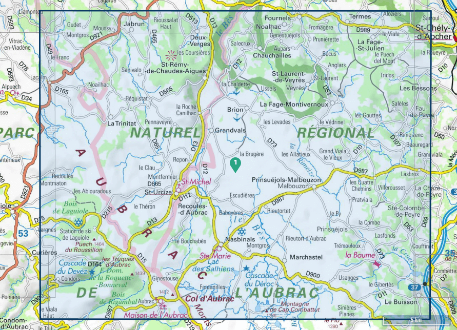 Te ontdekken: Massif de l'Aubrac,Lac des Salhiens,Bois de Laguiole, Forêt Domaniale de la Roquette-Bonneval, Bois de Rigambal,Puech du Roussillon, Monts du Massif de l'Aubrac, les Truques du Massif de l'Aubrac, Montagne de Cap Combattut, Monts d'Massif de l'Aubrac,Ste-Marie, Maison de l'Massif de l'Aubrac, la Baume, Grotte de Déroc, Cascade de Déroc