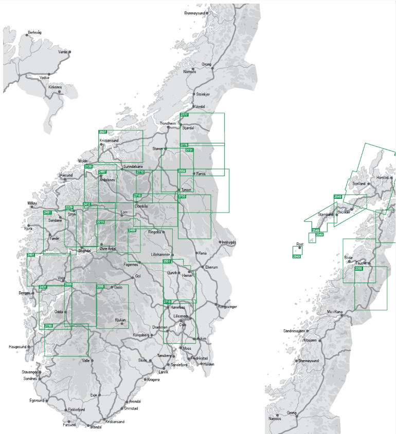 De nationale serie wandelkaarten bestaat uit ongeveer 200 kaarten, die de meest populaire wandelgebieden van Noorwegen aandoen. De wandelkaarten werden gepubliceerd in samenwerking met de Noorse Trekkersvereniging (DNT) en bevat hun routes en hutten. Met de kaarten beschikken de gebruikers over de meeste lokale informatie over de tochten.