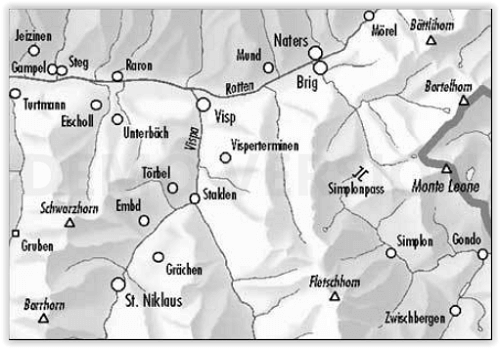 Visp, Brig-Glis, Naters, Turtmann, Gampel, Steg, Jeizinen, Raron, St.-Niklaus, Grächen, Törbel, Stalden, Unterbäch, Mund, Simplon, Gondo, Zwischbergen, Mörel, Gruben, Fletschhorn, Monte Leone, Punta del Rebbio, Schwarzhorn, Breithorn, Barrhorn, Bättlihorn, Lagginhorn, Simplonpass, Passo del Sempione, Lago d'Avino, Mattertal, Turtmanntal, Saastal.