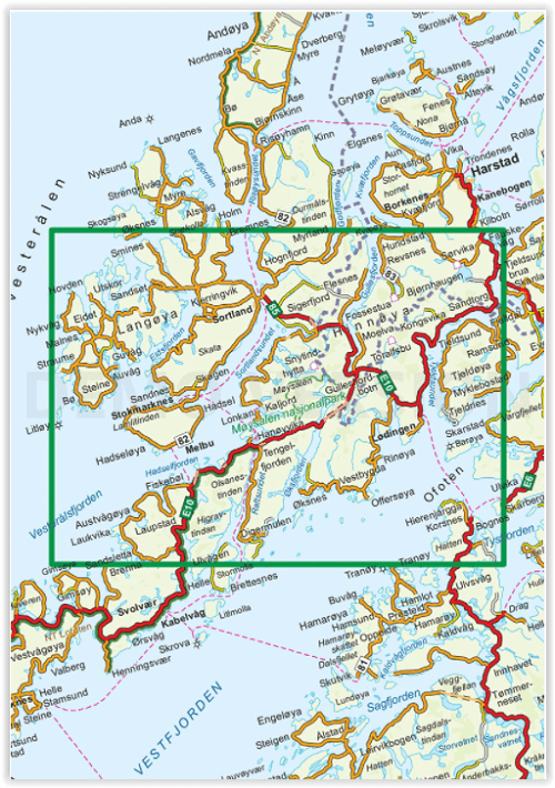 Productomschrijving: Deze topografische wandelkaart omvat het zuidelijke deel van het eiland Hinnoya. Hinnøya is dan ook het grootste eiland van Noorwegen. Een deel van het eiland behoort bij Nordland, en het andere, kleinere deel bij Troms og Finnmark.