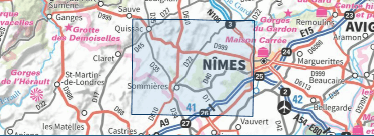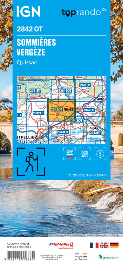 Wandelkaart Sommières & Vergèze - IGN Productomschrijving: Deze bevindt zich in de regio Occitanië in het departement van de Gard. Vergèze is een gemeente in het departement Gard (regio Occi...