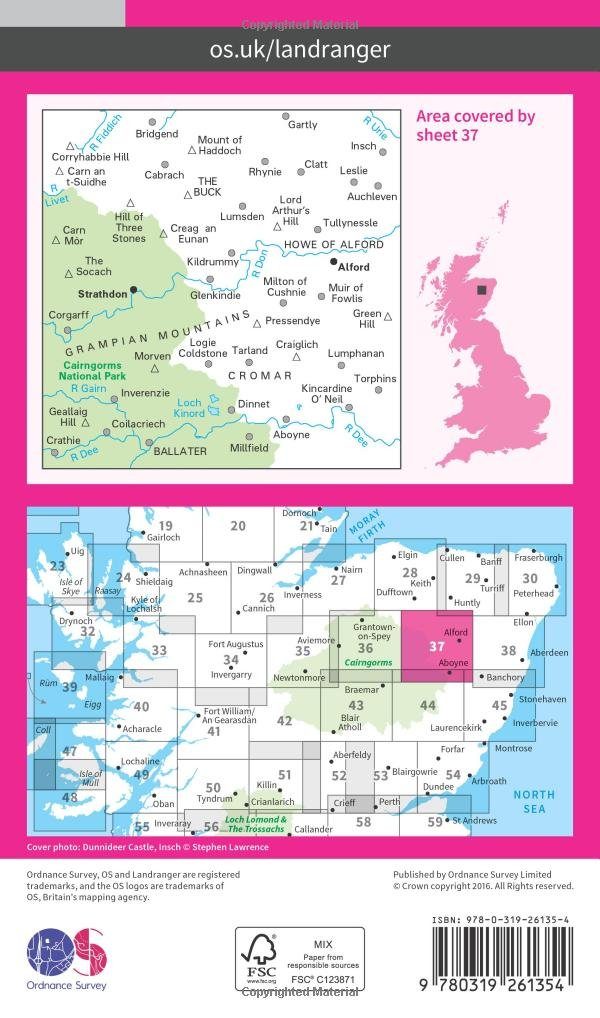 Productdiscription: On the eastern side of the Cairngorms National Park, OS Landranger map 37 covers Strathdon, Alford, Ballater, Aboyne, Inverenzie and Insch. The Grampian Mountains provide plenty of opportunities for exploration, although conditions, especially in winter, can be harsh.