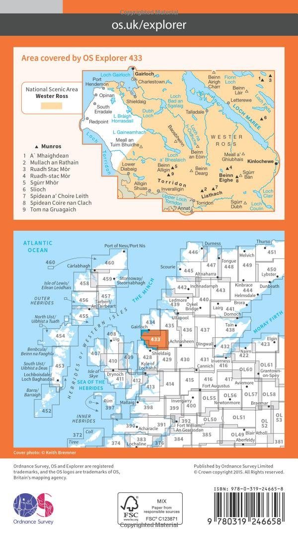 Productdiscription: OS Explorer Map 433 from Gairloch to Torridon represents some of the most dramatic scenery in the UK. With some serious mountains (and 9 Munros), there's plenty for the adventurous, while coastal fishing villages provide less energetic distractions. The OS Explorer map for Torridon - Beinn Eighe & Liathach is available in both the standard paper version and weatherproof 'Active' version.