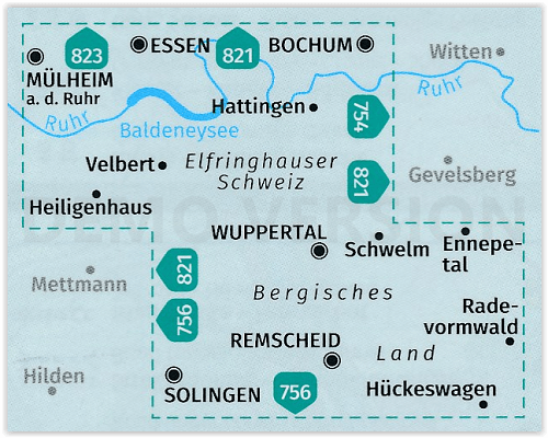 Mühlheim an der Ruhr, Essen, Bochum, Velbert, Heiligenhaus, Wuppertal, Schwelm, Ennepetal, Radevormwald, Remscheid, Solingen, Hückeswagen, Bergisches Land, Ruhr, Baldeneysee, Wupper, Wuppoertalsperre, Bevertalsperre, Rüggeberg.