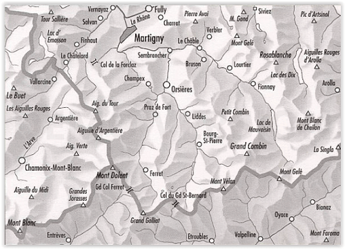 Martigny, Chamonix-Mont-Blanc, Argentière, Orsières, Champex, Fully, Verbier, Ferret, Praz de Fort, Bourg-St-Pierre, Liddes, Bruson, Lourtier, Fionnay, Arolla,Sembrancher, Le Châble, Finhaur, Vallorcine, Entrèves, Valpelline, Oyace, Bionaz, Etroubles, Mont Blanc, Mont Dolent, Grand Combin, Mont Vélan, Mont Gelé, Rosablanche, Aiguilles Rouges d'Arolla, La Singla, Petit Combin, Mont Blanc de Cheilon, Grand Golliat, Grandes Jorasses, Aiguille d'Argentière, Aiguille Verte, Le Buet, Les Aiguilles Rouges, Tour Sallière, Pierre Avoi, Mont Gond, Aiguille du Tour, Grand Col Ferret, Col du Grand St-Bernhard / Grosse Sankt Bernhard, Col de la Forclaz, Lac des Dix, Lac de Mauvoisin, Lac d'Emosson, Lac des Toules, Val Ferret, Val d'Entremont, Val de Bagnes.
