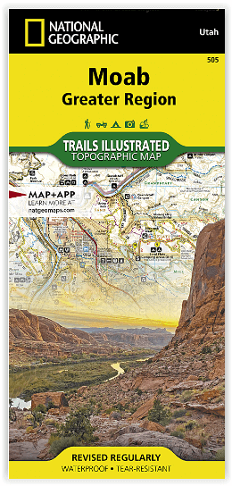 Deze kaart omvat het volledige gedeelte van het grote Moab recreatie gebied van het befamde National Geographic's Trails Illustrated. De kaart biedt een overzicht genummerd 505 op onderstaande kaart van het gebied. Het gebied omvat 3 kaarten met nummers, 505, 506 & 507. De 505 is de kaart die alles in één keer omvat, det 506 omvat het westelijke deel, en de 507 het Oostelijke gedeelte.