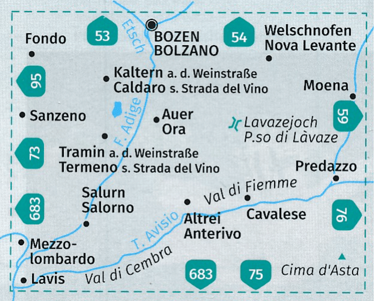 Steden, dorpen & gebieden: Bozen (Bolzano), Fondo, Welschnofen (Nova Levante), Kaltern (Calaro), Moena, Auer (Ora), Coredo, Tramin (Termeno), Predazzo, Salurn (Salorno), Altrei (Anterivo), Cavalese, Mezzolombardo, Lavis