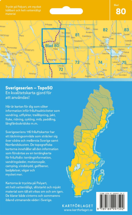 Een belangrijk kenmerk van de Sverigeserien is het duurzame materiaal. De kaarten zijn afgedrukt op waterafstotend en scheurvast synthetisch papier, waardoor ze bestand zijn tegen regen, wind en intensief gebruik. Ze zijn bovendien dubbelzijdig gedrukt, waardoor een groter gebied wordt weergegeven zonder in te boeten aan draagbaarheid.