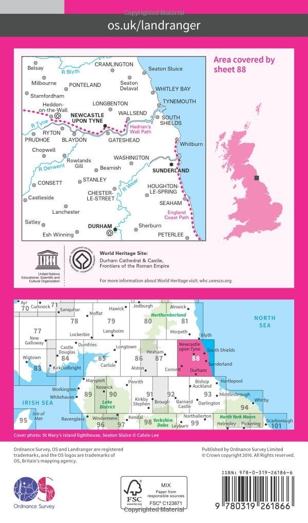 Productdiscription: Explore the easterly section of the Hadrian's Wall Path, along with taking in the historic cities of Newcastle upon Tyne and Durham. Other places included in the map are Gateshead, Sunderland, Seaham, Tynemouth, North Shields, South Shields, Blyth and Whitley Bay.