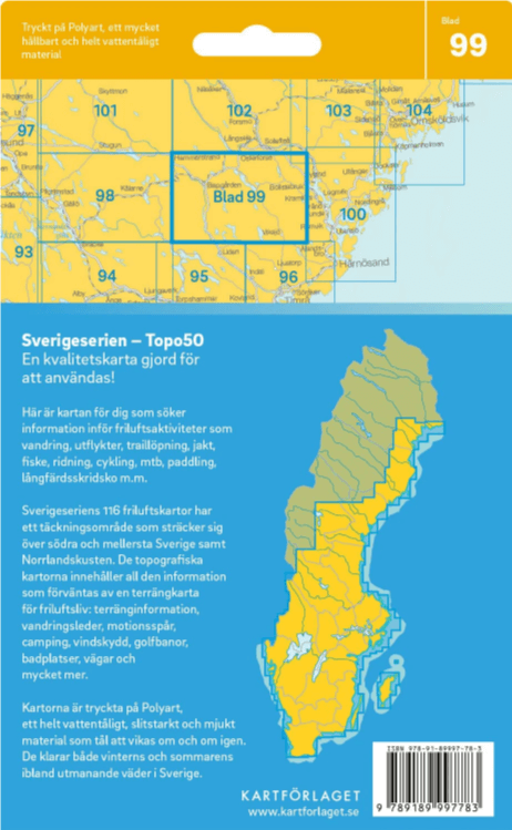 Een belangrijk kenmerk van de Sverigeserien is het duurzame materiaal. De kaarten zijn afgedrukt op waterafstotend en scheurvast synthetisch papier, waardoor ze bestand zijn tegen regen, wind en intensief gebruik. Ze zijn bovendien dubbelzijdig gedrukt, waardoor een groter gebied wordt weergegeven zonder in te boeten aan draagbaarheid.