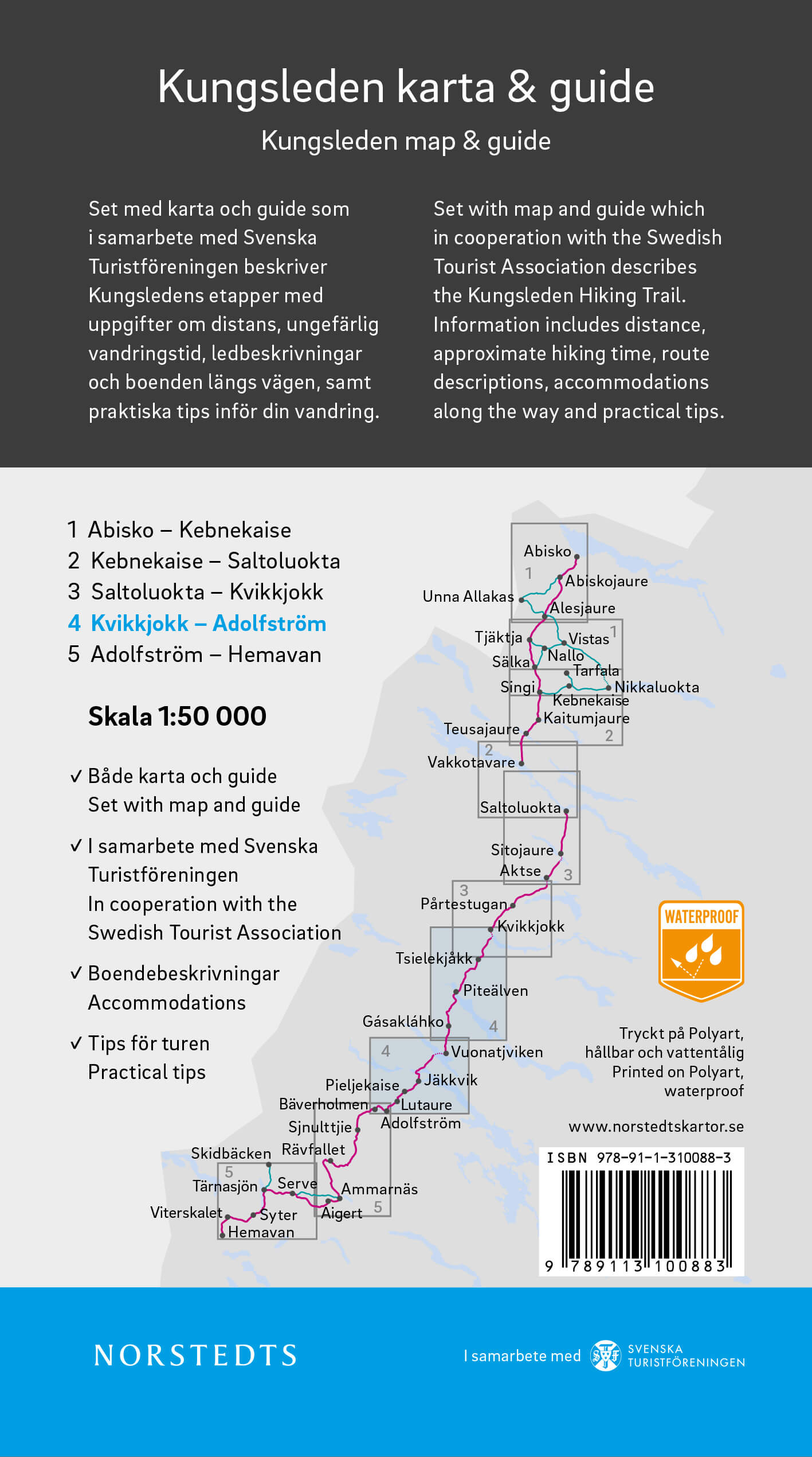 Detail omschrijving: Kungsleden Kart & Guide is een serie van 5 delen tussen Abisko en Hemavan, die is ontwikkeld in samenwerking met de Zweedse VVV. Elk deel bestaat uit een set met een volledig waterbestendige bergkaart op schaal 1:50 000 en een begeleidende gids die de etappes van Kungsleden beschrijft met informatie over afstand, geschatte wandeltijd, berginformatie zoals rustbescherming, bruggen en extra telefoons, routebeschrijvingen en accommodatie onderweg, evenals praktische tips. voor je wandeling.