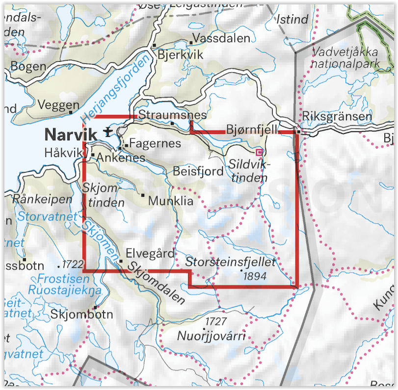 De kaart bevat ook meer paden dan elke eerdere kaart van hetzelfde gebied. Een kaart op een schaal van 1:25.000 is handig voor degenen onder u die een tocht naar de top rond Hunddalen plannen, naar Beisfjordtøtta (1448 meter boven zeeniveau) of Storsteinsfjellet (1894 meter boven zeeniveau). De kaart zal ook worden gebruikt door degenen die gemarkeerde paden willen verlaten om hun eigen routes in het hooggebergte te verkennen.