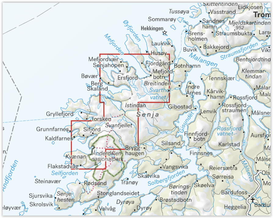 Een kaart op schaal 1:25.000 is handig als u een tocht naar de top plant naar Keipen (938 m), Breitinden (1001 m) of Kvænan (963 m). De kaart zal ook worden gebruikt door degenen die gemarkeerde paden willen verlaten om hun eigen routes in het hooggebergte te verkennen.