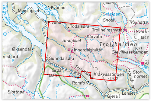 Hoogalpinekaart Sunndal & Innerdalen - Calazo Productomschrijving: Dit is één van de twee unieke kaarten met een schat aan details die nog nooit eerder zijn getoond over het gebied rond Trol...