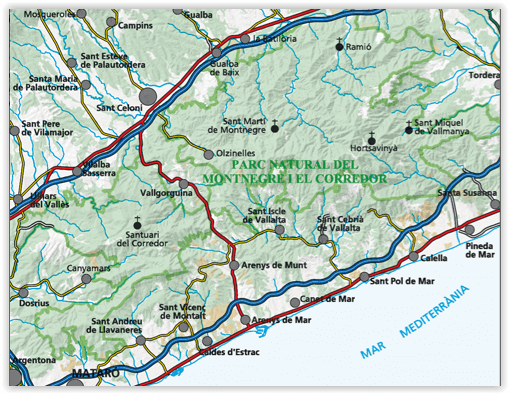Productomschrijving: Het Parc del Montnegre i el Corredor is een heuvelachtig en- bebost natuurgebied met wandel- en mountainbikepaden die langs ruïnes en boerderijen gaan. Het gebied ligt rakelings langs de kust van Catalonië in Spanje, en bied een grote hoeveelheid aan prachtige wandelroutes.