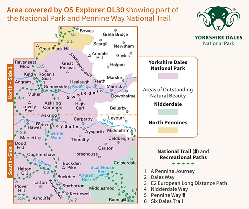 Omvat: Wensleydale & Swaledale, northern & Central areas of Yorkshire Dales National Park, with The Nidderdale & Northern Pennines AONB area's, A Pennine Journey, the Dales Way, E2 European Long distance Path, The Niddedale Way, the Pennine Way & Six Dales Trail.
