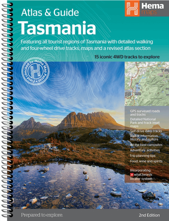 Wegenatlas Tasmanië atlas & gids - Hema Productomschrijving: The definitive guidebook for discovering Tasmania, featuring the Top 15 4WD Trips of the State and 5 of the best walking tracks. ...