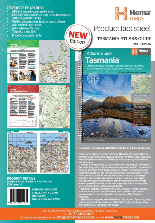 The guide features the Top 15 4WD Trips for Tassie, which has been field checked by Hema's Map Patrol. Also included is an introduction to the region, as well as information sections on planning the trip and what to see and do. There are detailed touring sections on the distinct regions of Tasmania. The Top 15 4WD Trips are broken into their respective localities, with each trip containing comprehensive trip information including gradings, distances, relevant travel information and drive coverage from start to finish.